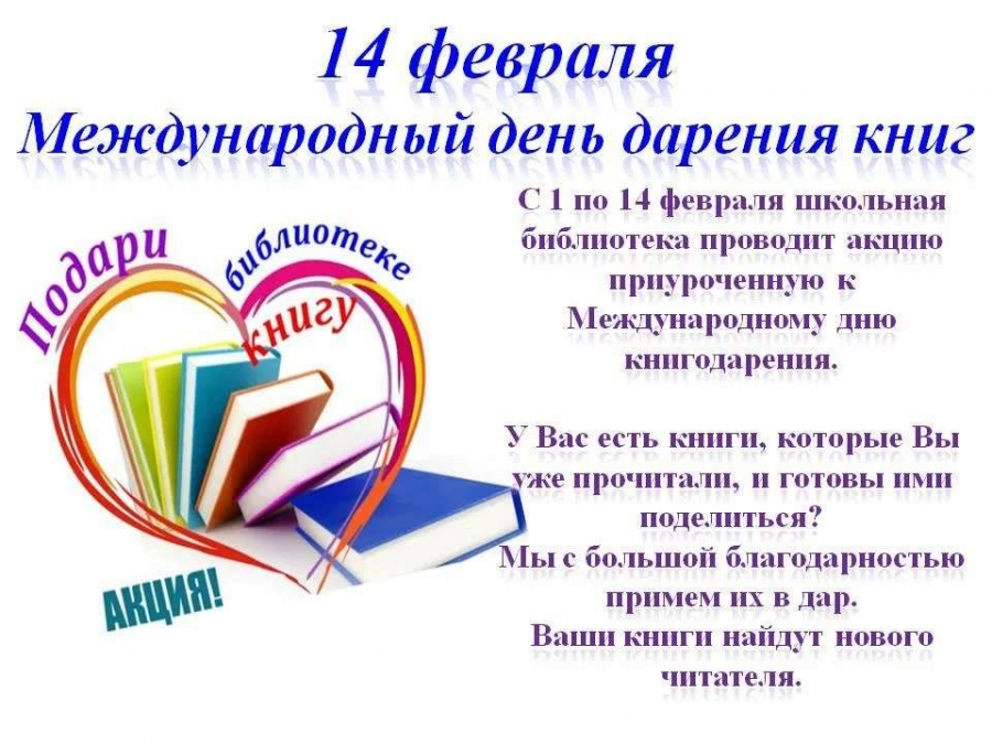 С 01.02.2026 по 14.02.2016 в библиотеке МБОУ «Кольчугинская школа №1 им. Авраамова Г.Н.» Симферопольского района Республики Крым пройдет Акция, приуроченная к Международному дню книгодарения – 14 февраля.