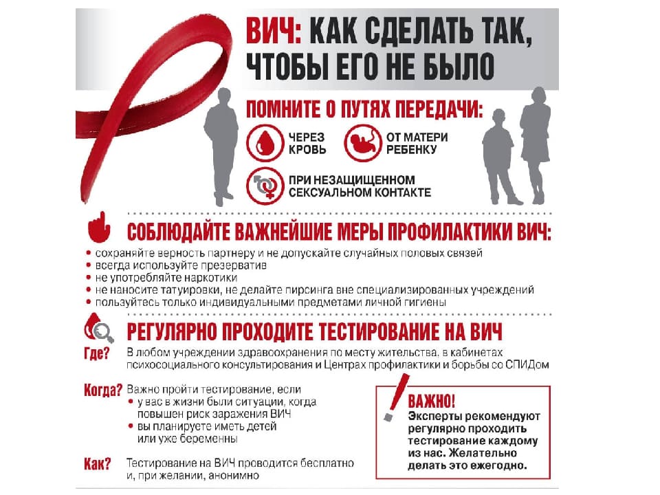 Пройти обследование на ВИЧ-инфекцию можно анонимно и бесплатно в любом лечебно-профилактическом учреждении, в центрах по профилактике и борьбе со СПИД.