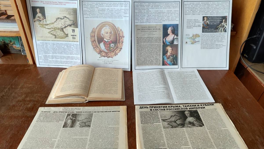 Для того чтобы приобщить обучающихся к истории принятия Крыма, Тамани и Кубани в состав Российской империи, углубить и расширить знания школьников по истории России библиотекарь МБОУ «Кольчугинская школа №1 им. Авраамова Г.Н.» Симферопольского района Республики Крым подготовила информационно-тематическую выставку-беседу.