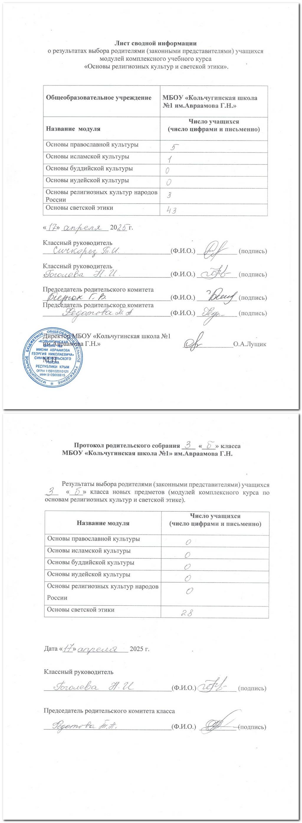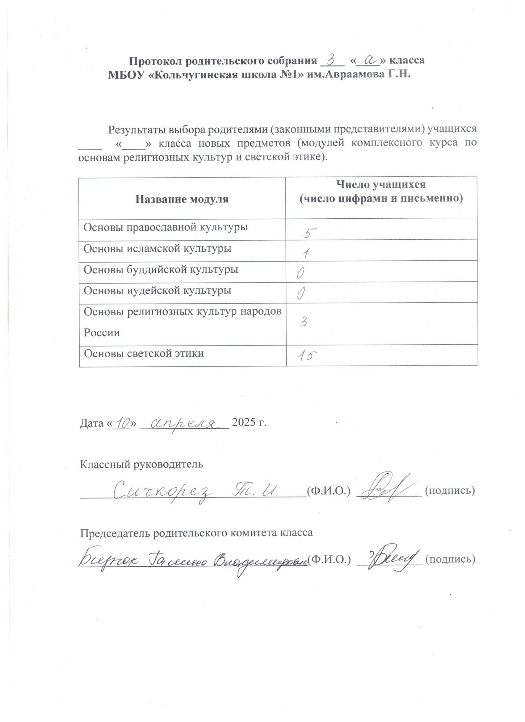Лист сводной информации о результатах выбора родителями модулей комплексного учебного курса "Основы религиозных культур и светской этики"